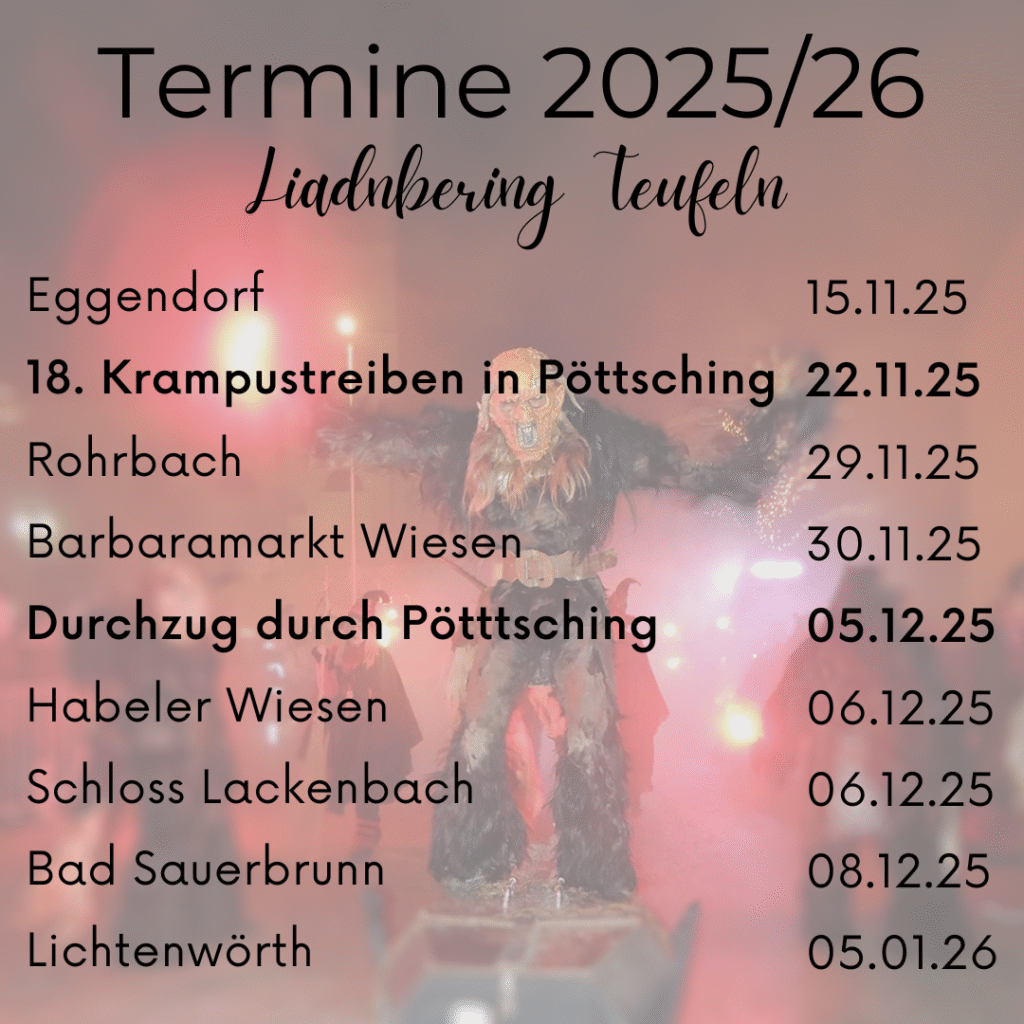 Die Termine für unsere kommende Krampussaison stehen fest! Wir freuen uns, euch auch in diesem Jahr wieder schaurige Auftritte und düstere Begegnungen mit dem Krampus bieten zu können.
